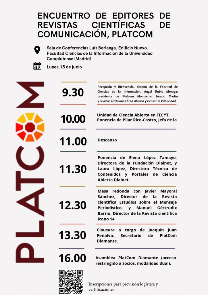 Previamente se habrá realizado la recepción de inscritos y la bienvenida institucional a cargo de Ángel Rubio Moraga, decano de la Facultad de Ciencias de la Información, junto a la presidenta de PlatCom Montserrat Jurado Martín y las revistas anfitrionas Área Abierta y Pensar la Publicidad representadas por sus editores. Este inicio está previsto a las 9.30 horas.